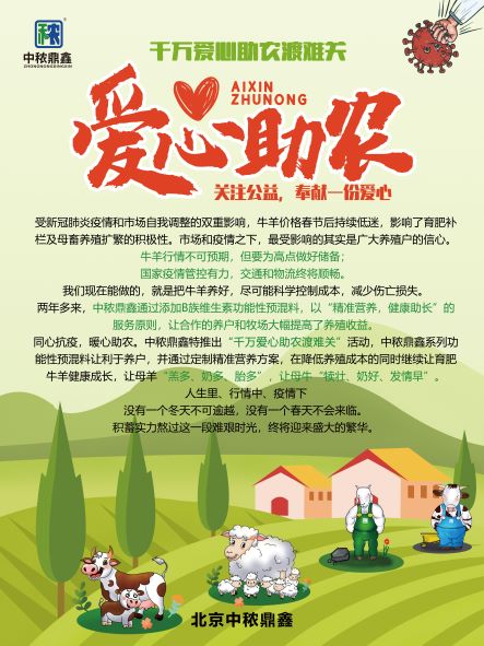 同心抗疫,暖心助農(nóng)。中秾鼎鑫特推出“千萬(wàn)愛(ài)心助農(nóng)渡難關(guān)”活動(dòng),中秾鼎鑫系列功能性預(yù)混料讓利于養(yǎng)戶(hù),并通過(guò)定制精準(zhǔn)營(yíng)養(yǎng)方案,在降低養(yǎng)殖成本的同時(shí)繼續(xù)讓育肥牛羊健康成長(zhǎng),讓母羊“羔多、奶多、胎多”,讓母牛“犢壯、奶好、發(fā)情早”。